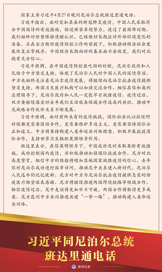 新華社北京4月27日電 國家主席習近平27日晚同尼泊爾總統(tǒng)班達里通電話。
