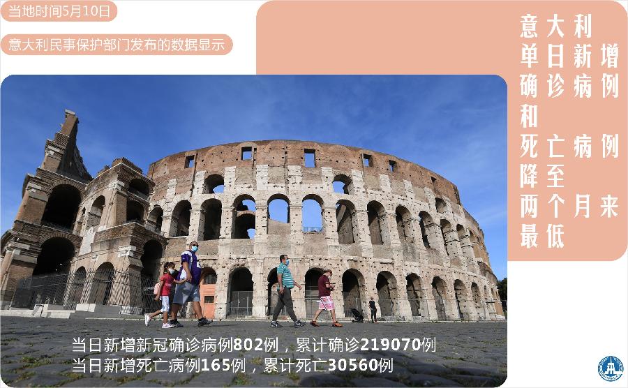 新華社羅馬5月10日電(記者李潔)意大利民事保護(hù)部門10日發(fā)布的數(shù)據(jù)顯示,意大利當(dāng)天新增新冠確診病例802例,累計確診219070例;新增死亡病例165例,累計死亡30560例。單日新增確診病例和新增死亡病例均為過去兩個月來最低水平。