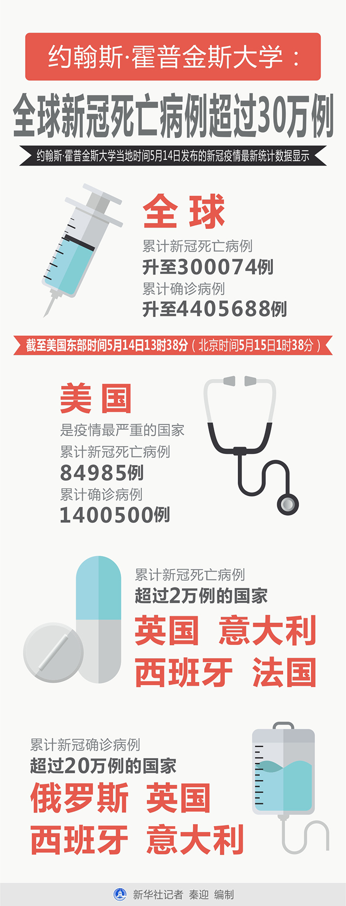 新華社北京5月15日電 ?14日全球疫情簡報:美研究機(jī)構(gòu)統(tǒng)計美國新冠確診超140萬 全球病亡超30萬