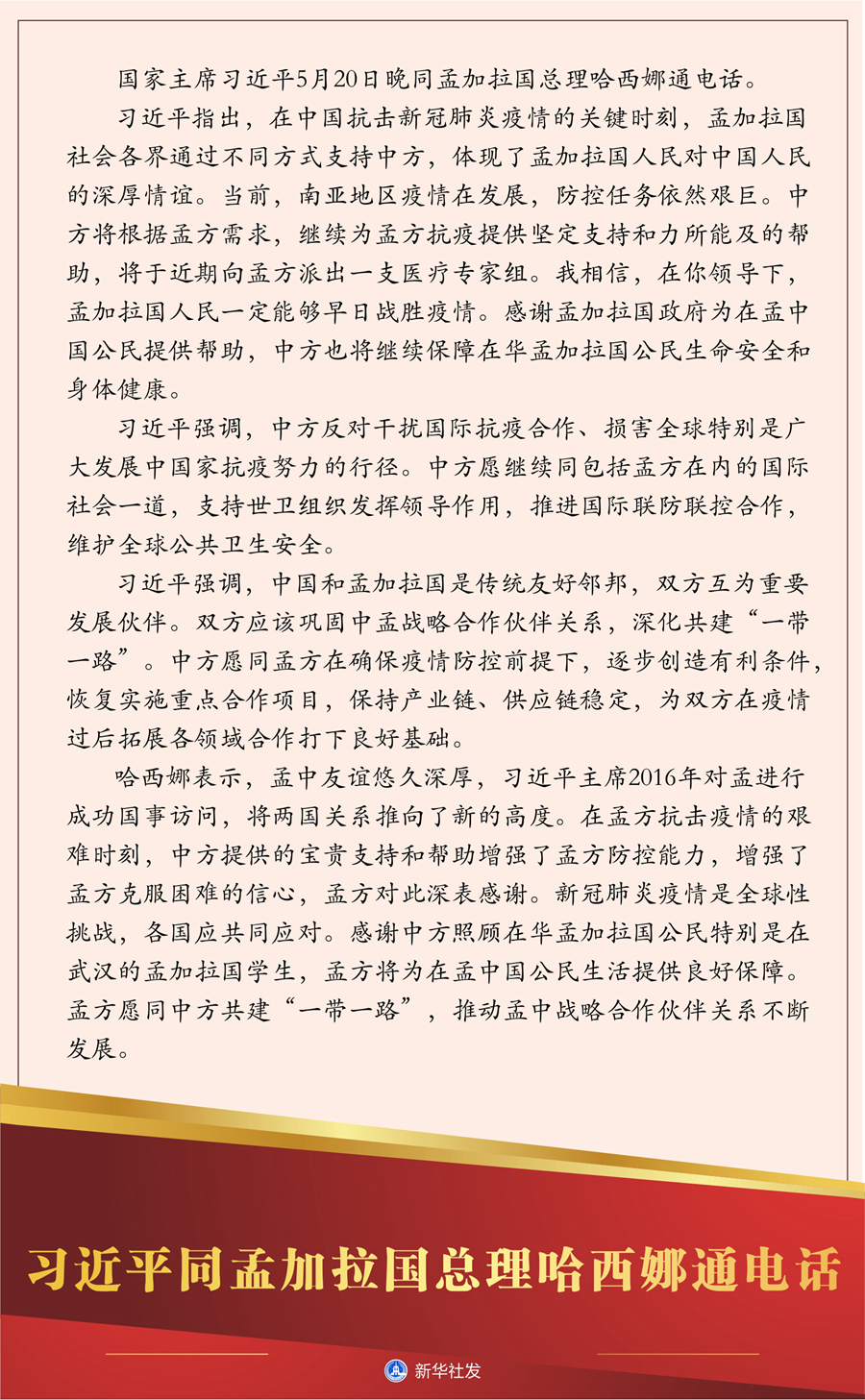 新華社北京5月20日電 國(guó)家主席習(xí)近平5月20日晚同孟加拉國(guó)總理哈西娜通電話。