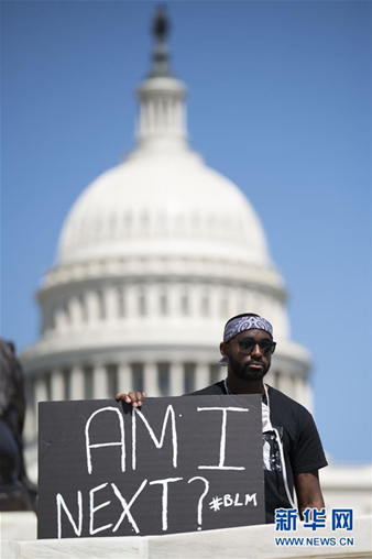 5月30日,在美國(guó)首都華盛頓國(guó)會(huì)山附近,一名男子手持標(biāo)語(yǔ)參加抗議活動(dòng)。 新華社記者 劉杰 攝