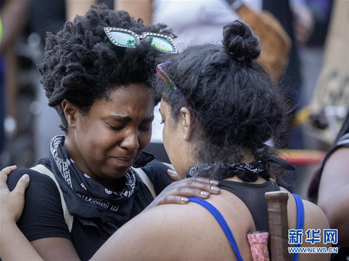 5月28日,在美國(guó)明尼阿波利斯市,抗議者集會(huì)時(shí)相互擁抱。新華社/美聯(lián)