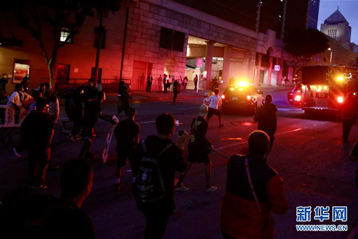5月29日晚,在美國(guó)洛杉磯,抗議者在街頭游行示威。新華社發(fā)
