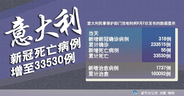 新華社羅馬6月2日電(記者陳占杰)意大利民事保護(hù)部門2日發(fā)布的數(shù)據(jù)顯示,該國(guó)當(dāng)天新增新冠確診病例318例,累計(jì)確診233515例;新增死亡病例55例,累計(jì)死亡33530例。