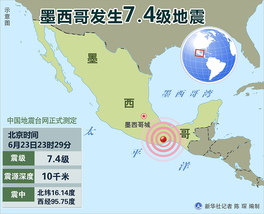 新華社北京6月23日電 據(jù)中國(guó)地震臺(tái)網(wǎng)正式測(cè)定:6月23日23時(shí)29分在墨西哥(北緯16.14度,西經(jīng)95.75度)發(fā)生7.4級(jí)地震,震源深度10千米。