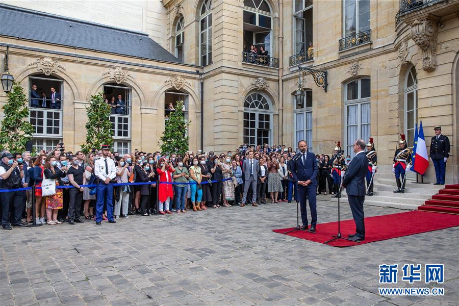 7月3日,在法國巴黎總理府,卸任總理愛德華·菲利普與新任總理讓·卡斯泰出席權(quán)力交接儀式。新華社發(fā)(奧雷利安·莫里薩爾 攝)