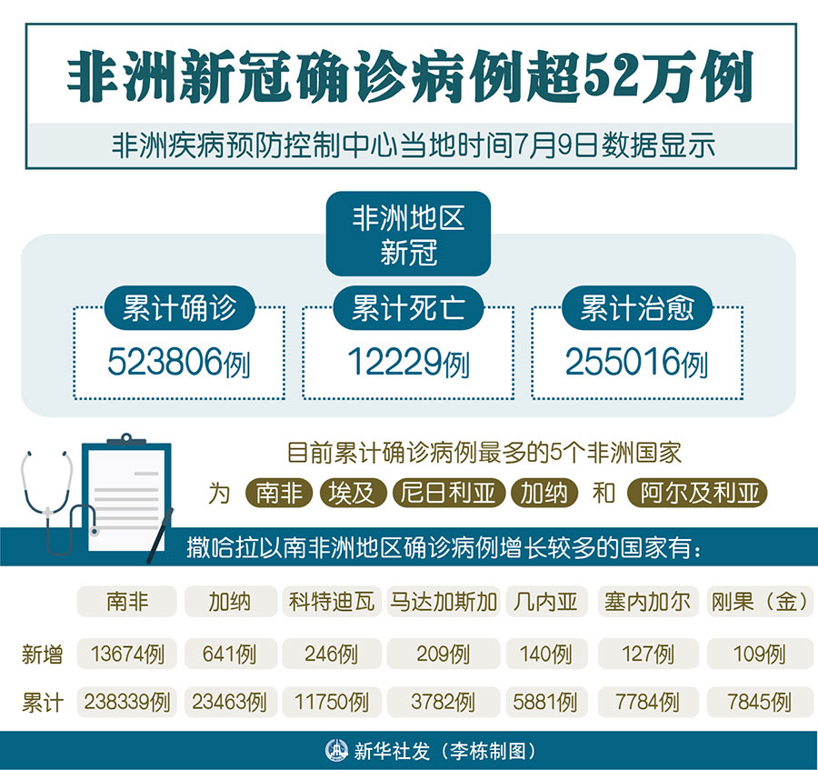新華社雅溫得7月9日電 綜合新華社駐非洲地區(qū)記者報道:非洲疾病預(yù)防控制中心9日數(shù)據(jù)顯示,非洲地區(qū)新冠累計確診病例已達523806例,累計死亡12229例,累計治愈255016例。