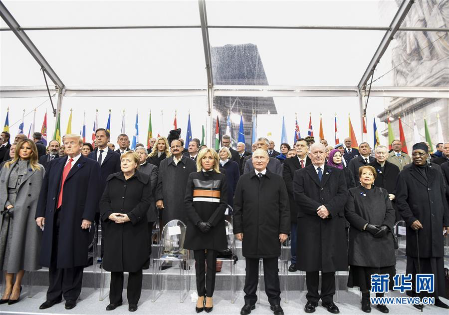 2018年11月11日,在法國(guó)巴黎,俄羅斯總統(tǒng)普京(前右四)、德國(guó)總理默克爾(前左三)與美國(guó)總統(tǒng)特朗普(前左二)出席紀(jì)念儀式。當(dāng)日,法國(guó)政府在巴黎凱旋門(mén)前舉行儀式,隆重紀(jì)念第一次世界大戰(zhàn)結(jié)束一百周年。新華社記者 陳益宸 攝