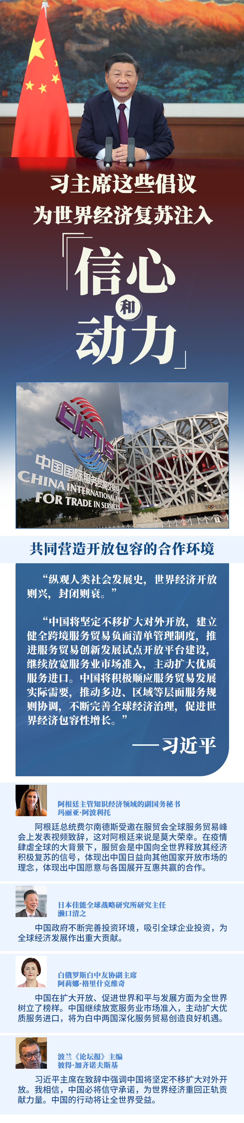 在全球范圍新冠疫情尚未得到全面控制、經(jīng)濟全球化遭遇逆流的背景下,習主席就促進全球服務業(yè)開放合作提出3點倡議,為推動世界經(jīng)濟盡快復蘇注入信心和動力,向國際社會展現(xiàn)中國負責任大國的作為和擔當。
