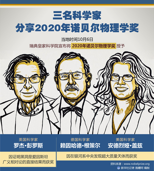 新華社斯德哥爾摩10月6日電(記者和苗 付一鳴)瑞典皇家科學(xué)院6日宣布,將2020年諾貝爾物理學(xué)獎授予三名科學(xué)家。英國科學(xué)家羅杰·彭羅斯因證明黑洞是愛因斯坦廣義相對論的直接結(jié)果而獲獎;德國科學(xué)家賴因哈德·根策爾和美國科學(xué)家安德烈婭·蓋茲因在銀河系中央發(fā)現(xiàn)超大質(zhì)量天體而獲獎。