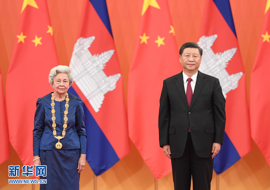 11月6日,國(guó)家主席習(xí)近平在北京人民大會(huì)堂為柬埔寨太后莫尼列舉行中華人民共和國(guó)“友誼勛章”頒授儀式。 新華社記者 申宏 攝