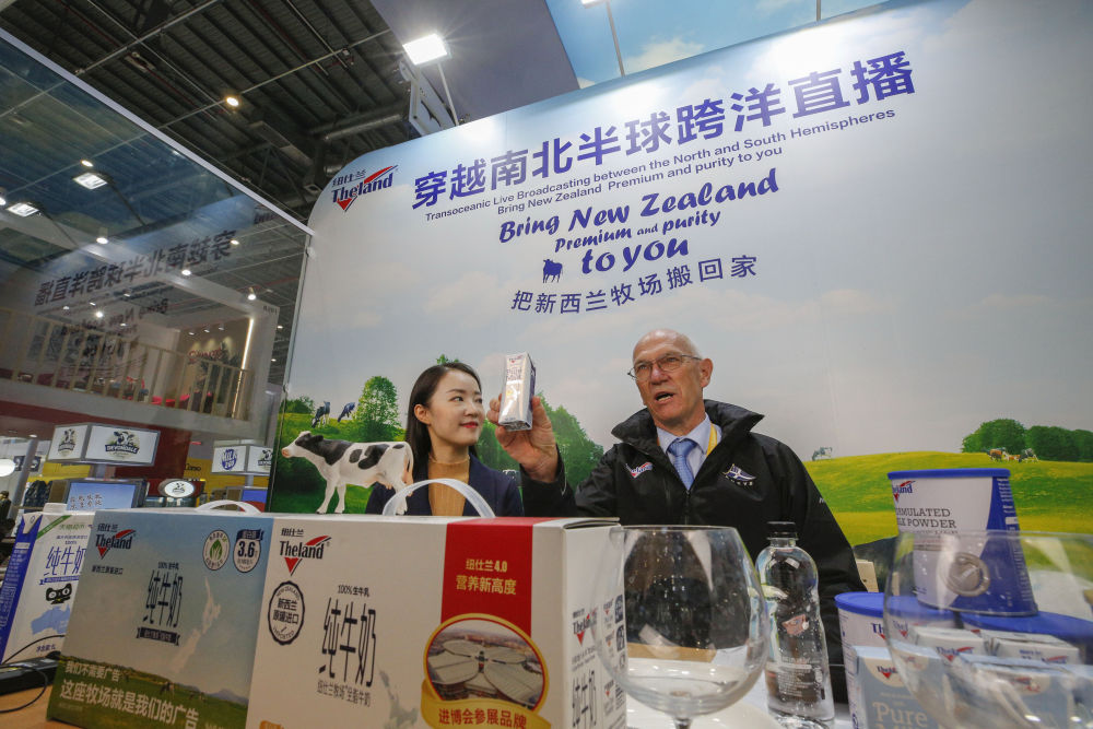 11月7日,羅伊(右)在第三屆進(jìn)博會紐仕蘭乳業(yè)展臺直播帶貨。