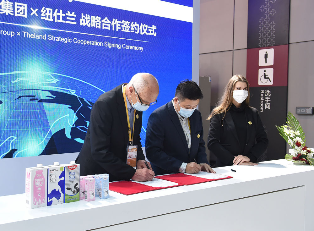 11月5日,羅伊(左一)在進(jìn)博會上的紐仕蘭乳業(yè)展臺參加簽約儀式。