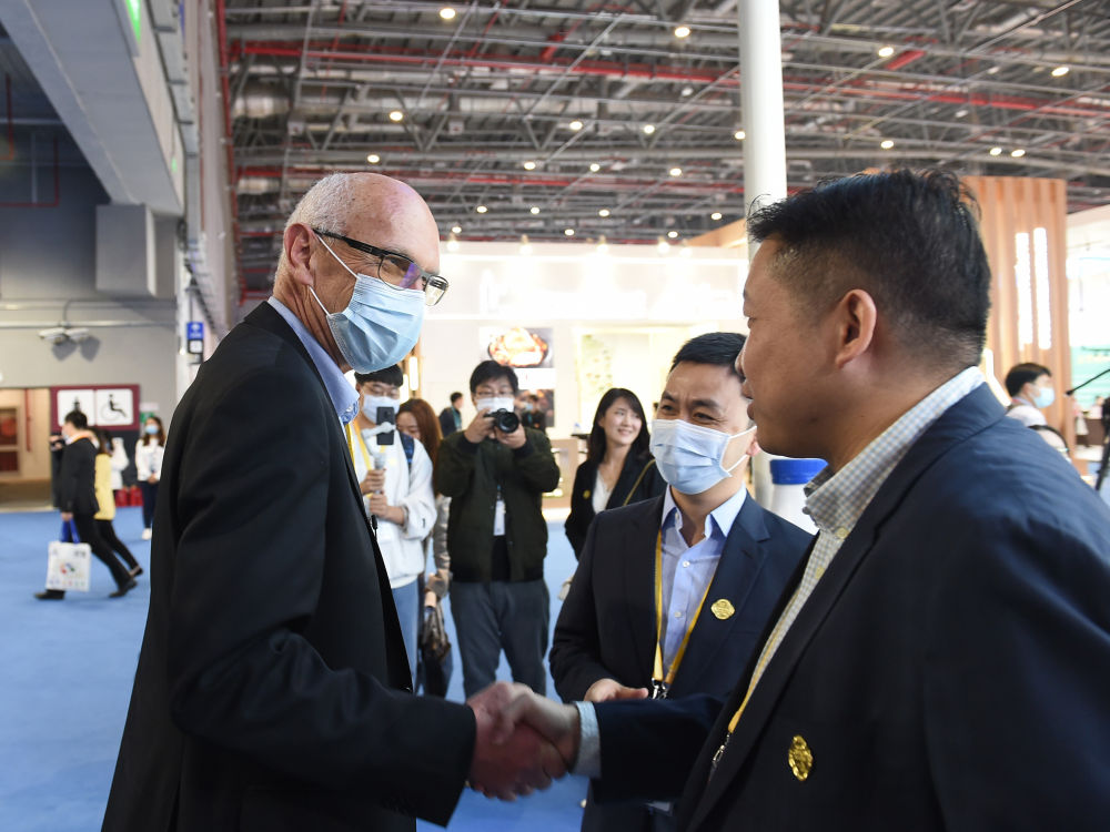 11月5日,羅伊(左)在第三屆進(jìn)博會現(xiàn)場同合作伙伴交談。