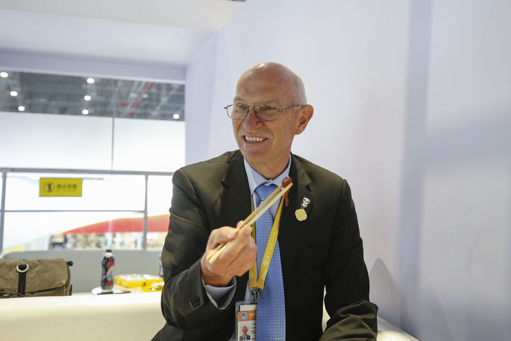 11月7日,午休時(shí),羅伊在第三屆進(jìn)博會紐仕蘭乳業(yè)展臺使用筷子吃飯。