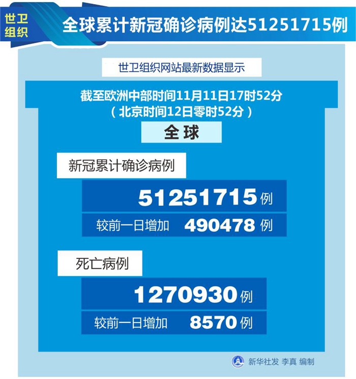 世衛(wèi)組織網(wǎng)站最新數(shù)據(jù)顯示,截至歐洲中部時(shí)間11日17時(shí)52分(北京時(shí)間12日零時(shí)52分),全球確診病例較前一日增加490478例,達(dá)到51251715例;死亡病例增加8570例,達(dá)到1270930例。