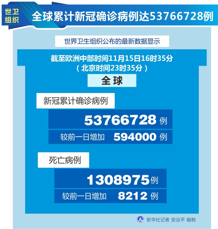 新華社日內(nèi)瓦11月15日電(記者劉曲)世界衛(wèi)生組織15日公布的最新數(shù)據(jù)顯示,全球累計新冠確診病例達53766728例。