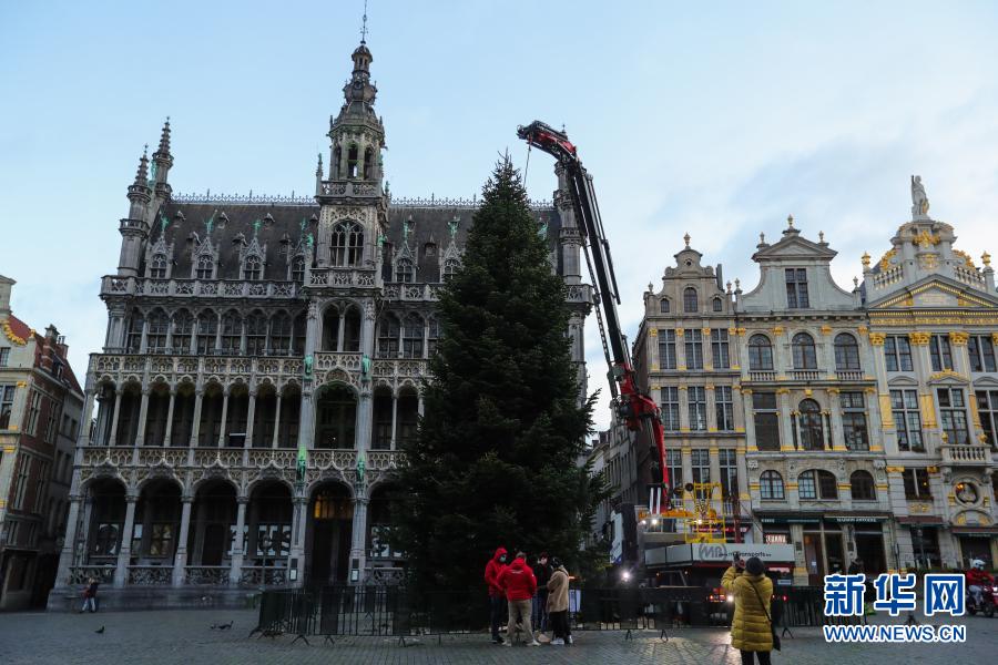 這是11月19日在比利時布魯塞爾大廣場拍攝的圣誕樹安裝現(xiàn)場。