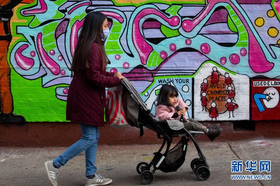 11月21日,在美國紐約,一名女子推著孩子經過抗疫宣傳壁畫。美國約翰斯·霍普金斯大學21日發(fā)布的新冠疫情最新統(tǒng)計數據顯示,美國累計確診病例超過1200萬例。新華社發(fā)(郭克攝)