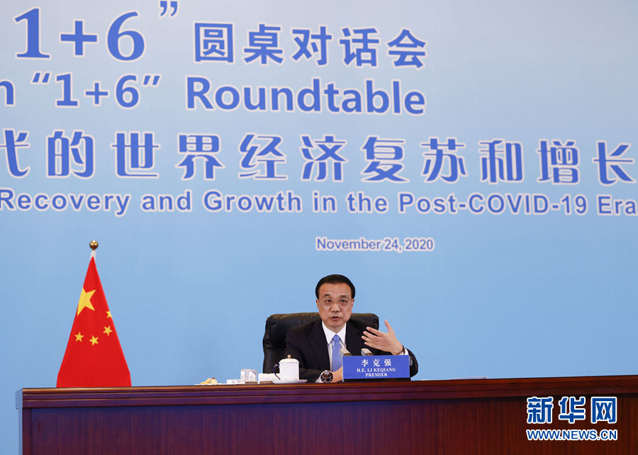 11月24日晚,國務(wù)院總理李克強(qiáng)在北京釣魚臺(tái)國賓館同世界銀行行長馬爾帕斯、國際貨幣基金組織總裁格奧爾基耶娃、世界貿(mào)易組織副總干事沃爾夫、國際勞工組織總干事賴德、經(jīng)濟(jì)合作與發(fā)展組織秘書長古里亞和金融穩(wěn)定理事會(huì)主席夸爾斯舉行第五次“1+6”圓桌對話會(huì)。會(huì)議以視頻方式舉行。新華社記者 黃敬文 攝
