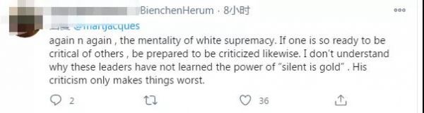 “又一次,白人至上的心態(tài)。如果一個人準(zhǔn)備好批評別人,也要準(zhǔn)備好同樣地被批評。我不明白為什么這些領(lǐng)導(dǎo)人沒有學(xué)會‘沉默就是金子’的力量。他的批評只會讓事情變得更糟?!?/font>