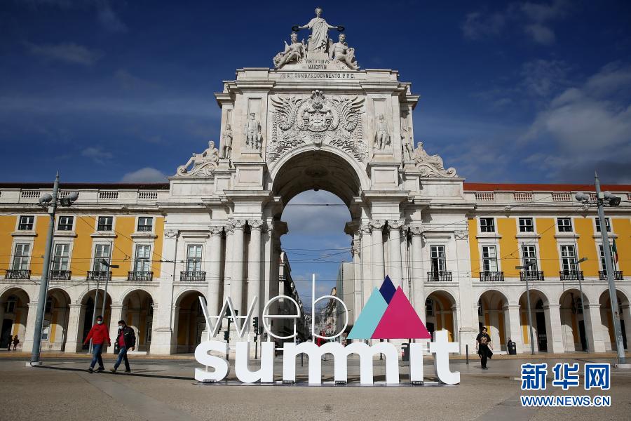 11月30日,在葡萄牙里斯本,戴口罩的行人走過2020年網(wǎng)絡(luò)峰會的立體標(biāo)識。