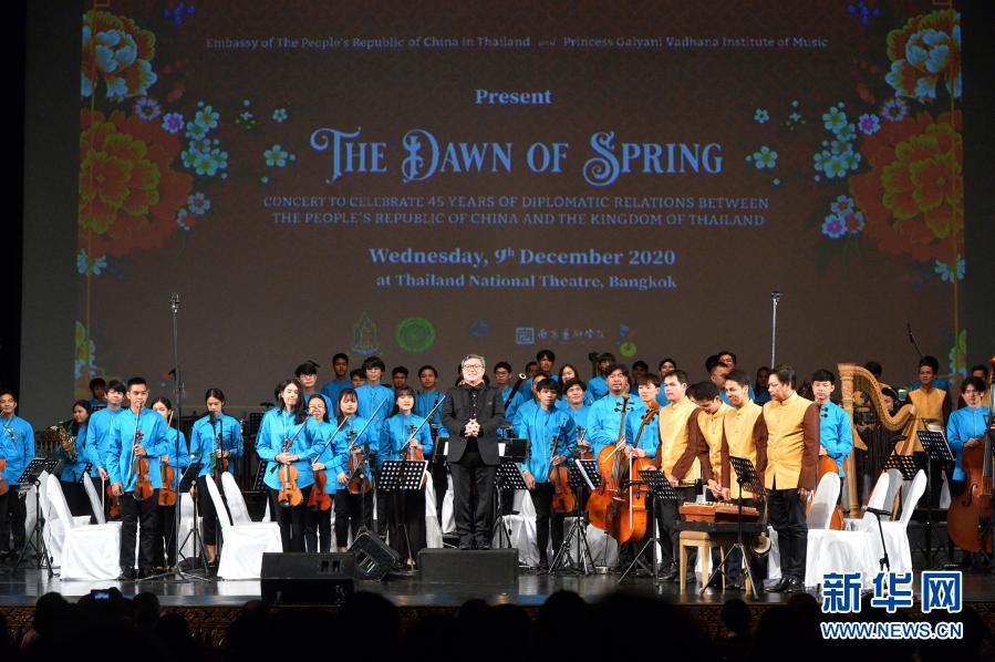 12月9日,在泰國曼谷國家大劇院,干拉耶尼音樂學院交響樂團在慶祝中泰建交45周年音樂會上謝幕。新華社發(fā)(拉亨攝)