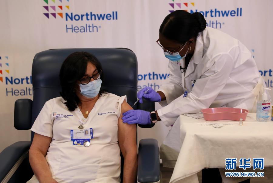 12月14日,在美國紐約長島猶太醫(yī)療中心,護(hù)士斯蒂芬妮·凱爾(左)接種新冠疫苗。新華社記者王迎攝