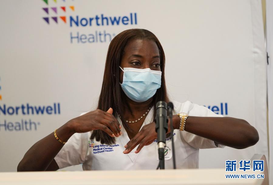 12月14日,在美國紐約,長島猶太醫(yī)療中心重癥監(jiān)護(hù)室護(hù)士桑德拉·琳賽接種新冠疫苗后參加新聞發(fā)布會。新華社記者王迎攝