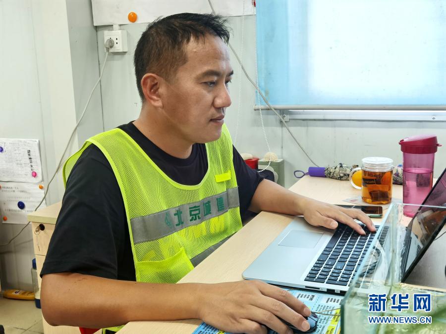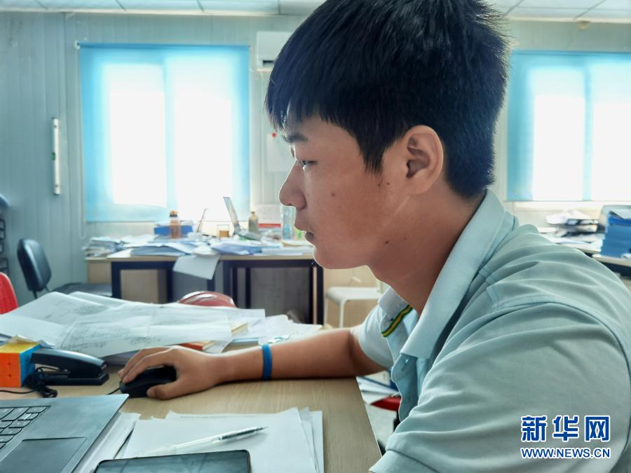 12月14日,在馬爾代夫馬累,臉上有口罩印的安全工程師劉平建在維拉納國際機(jī)場水飛航站樓項(xiàng)目辦公室工作。新華社發(fā)(北京城建集團(tuán)供圖)