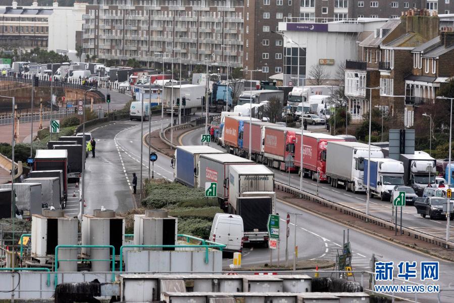 此前,為應對英國近期出現的變異新冠病毒,法國宣布從當地時間20日午夜起48小時內禁止來自英國的所有人員旅行,包括與公路、鐵路、航空、水路有關的貨運人員旅行。這給英國與歐盟國家之間的貨物運輸帶來極大影響。自邊境關閉以來,大約有2850輛卡車被困在英國肯特郡。
