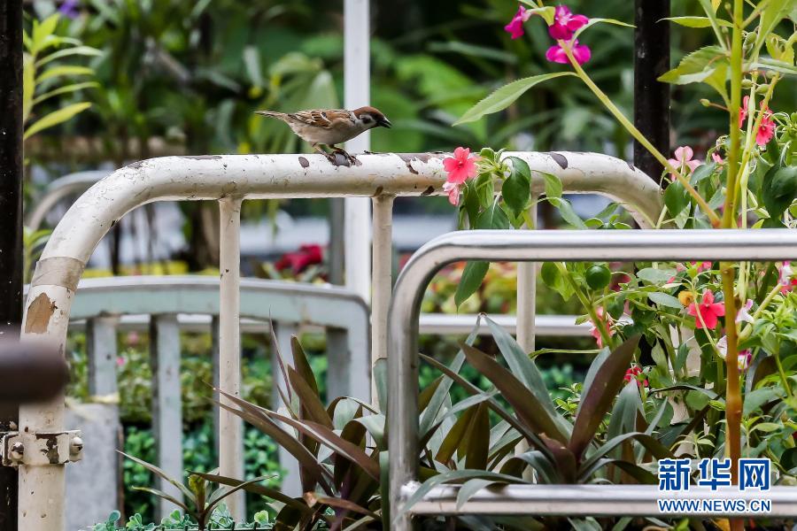 3月18日,在位于馬尼拉的菲律賓大學附屬菲律賓總醫(yī)院,一只麻雀站在“低語的花床”藝術裝置上。