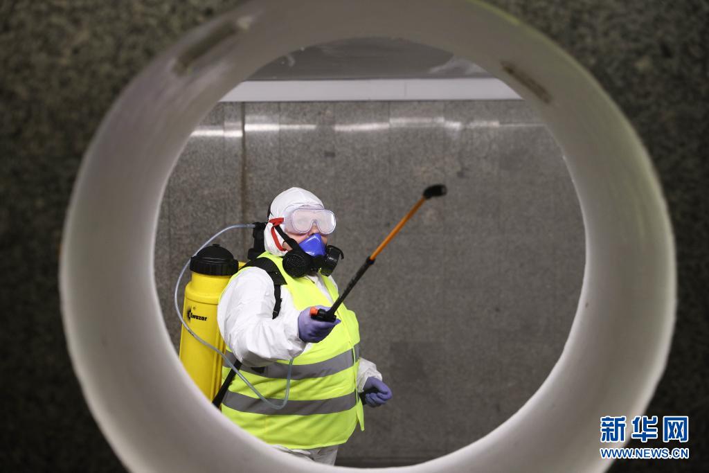 4月10日,工作人員在波蘭華沙為公共場所消毒。