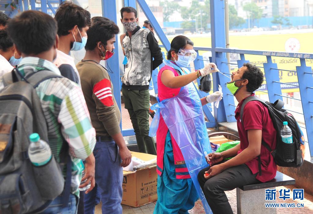 4月11日,一名男子在印度班加羅爾的一個公交站接受新冠病毒檢測取樣。