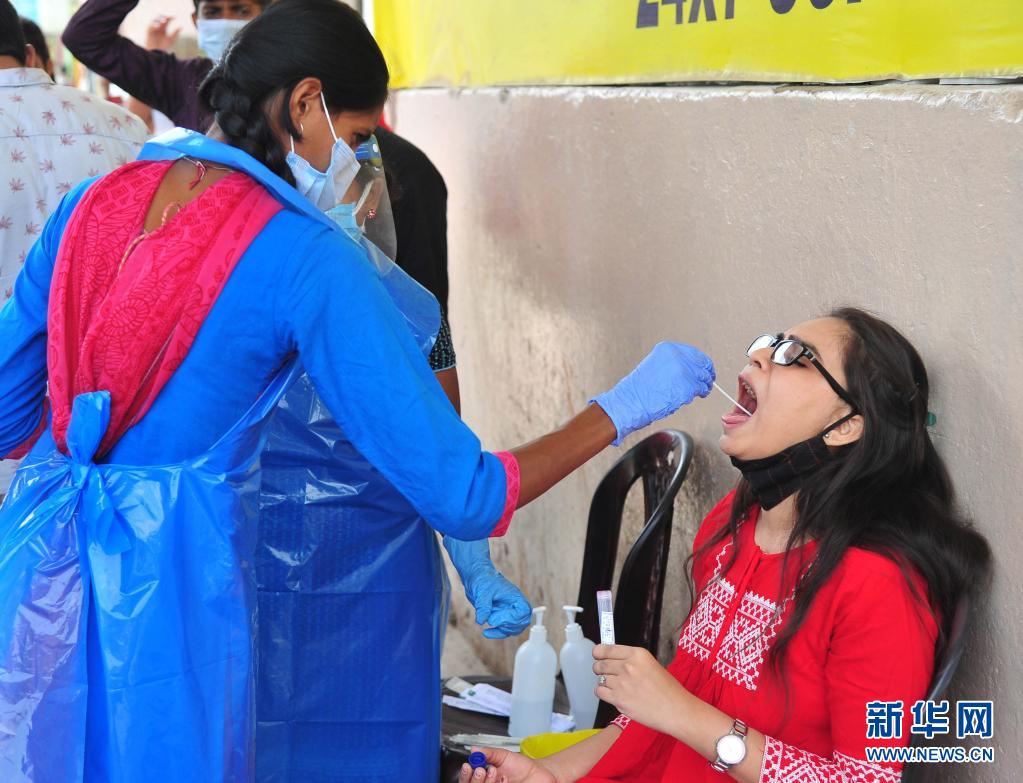 4月11日,一名女子在印度班加羅爾的一個(gè)公交站接受新冠病毒檢測(cè)取樣。
