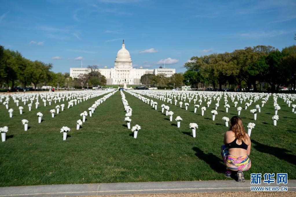 4月13日,一名女子觀看美國(guó)華盛頓國(guó)家廣場(chǎng)草坪上擺放的白色絹花。