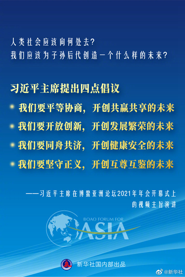 博鰲亞洲論壇2021年年會(huì)開幕式20日上午在海南博鰲舉行,國(guó)家主席習(xí)近平以視頻方式發(fā)表主旨演講。面對(duì)“人類社會(huì)應(yīng)該向何處去?我們應(yīng)該為子孫后代創(chuàng)造一個(gè)什么樣的未來?”這一重大命題,習(xí)近平主席提出四點(diǎn)倡議。