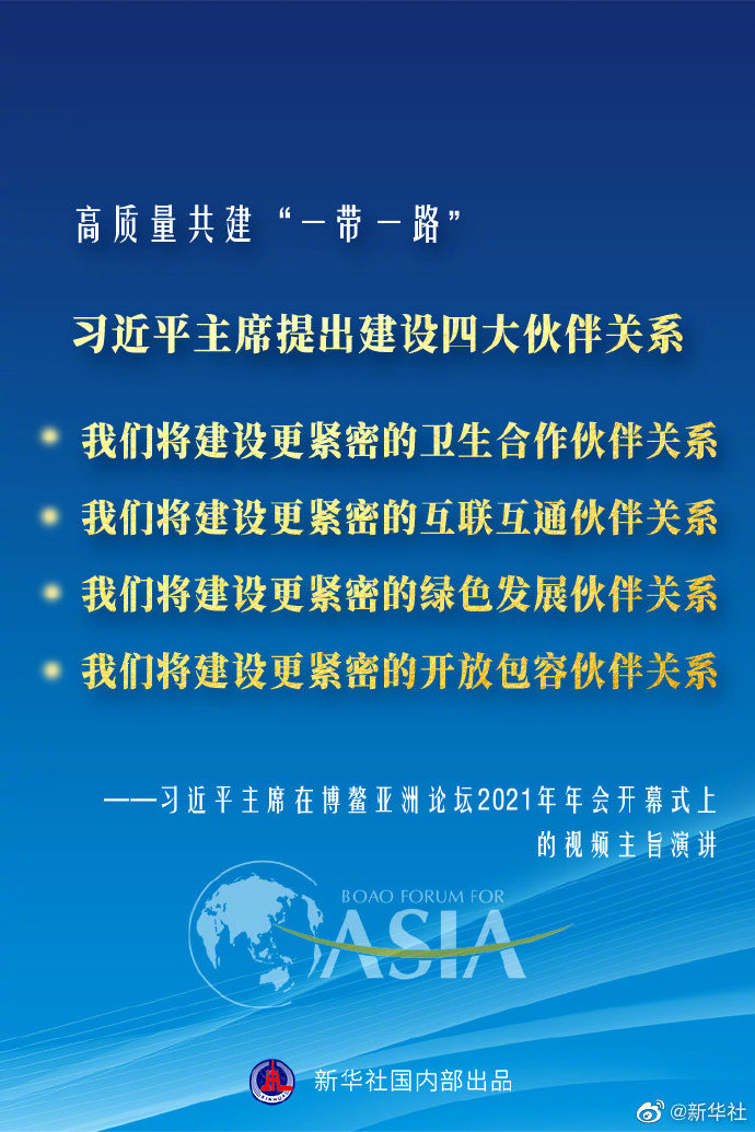 博鰲亞洲論壇2021年年會(huì)開幕式20日上午在海南博鰲舉行,國(guó)家主席習(xí)近平以視頻方式發(fā)表主旨演講。針對(duì)高質(zhì)量共建“一帶一路”,習(xí)近平主席提出建設(shè)四大伙伴關(guān)系。 ?????