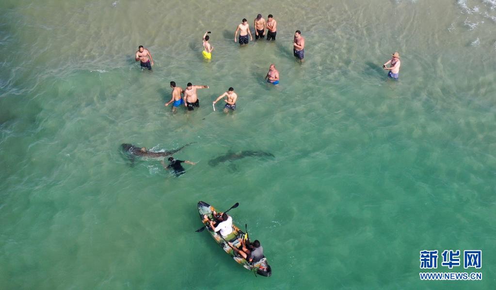 4月20日,在以色列北部城市哈代拉的海邊,鯊魚從人們身邊游過(無人機照片)。