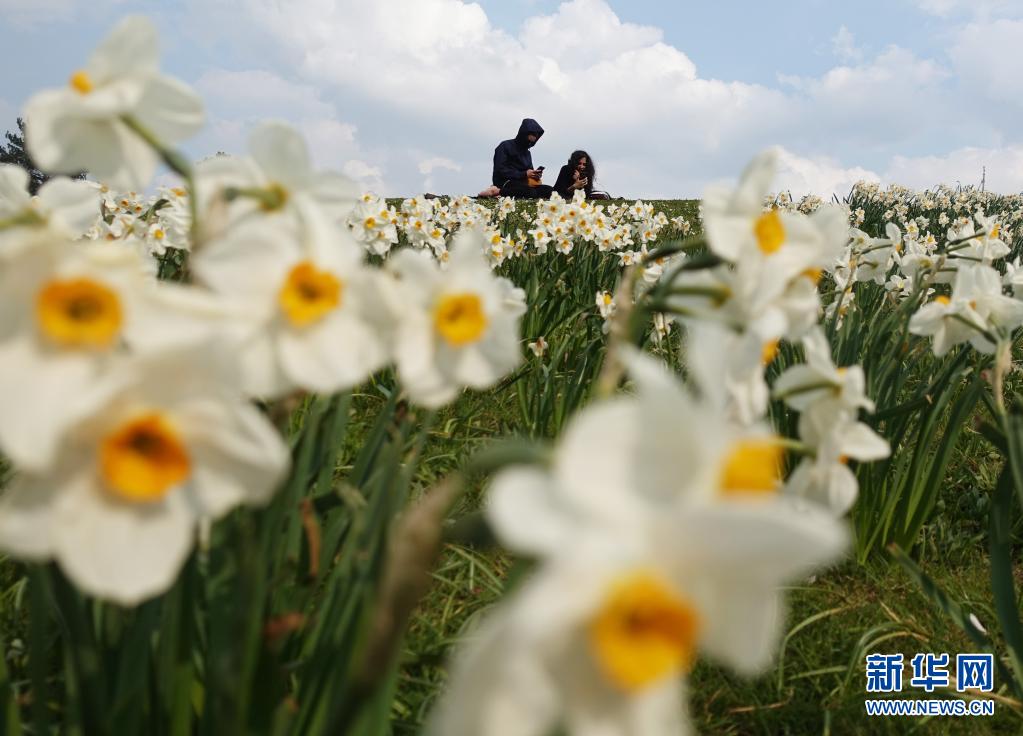 4月21日,在法國(guó)巴黎一處公園,人們?cè)邗r花盛開的山坡上曬太陽(yáng)。