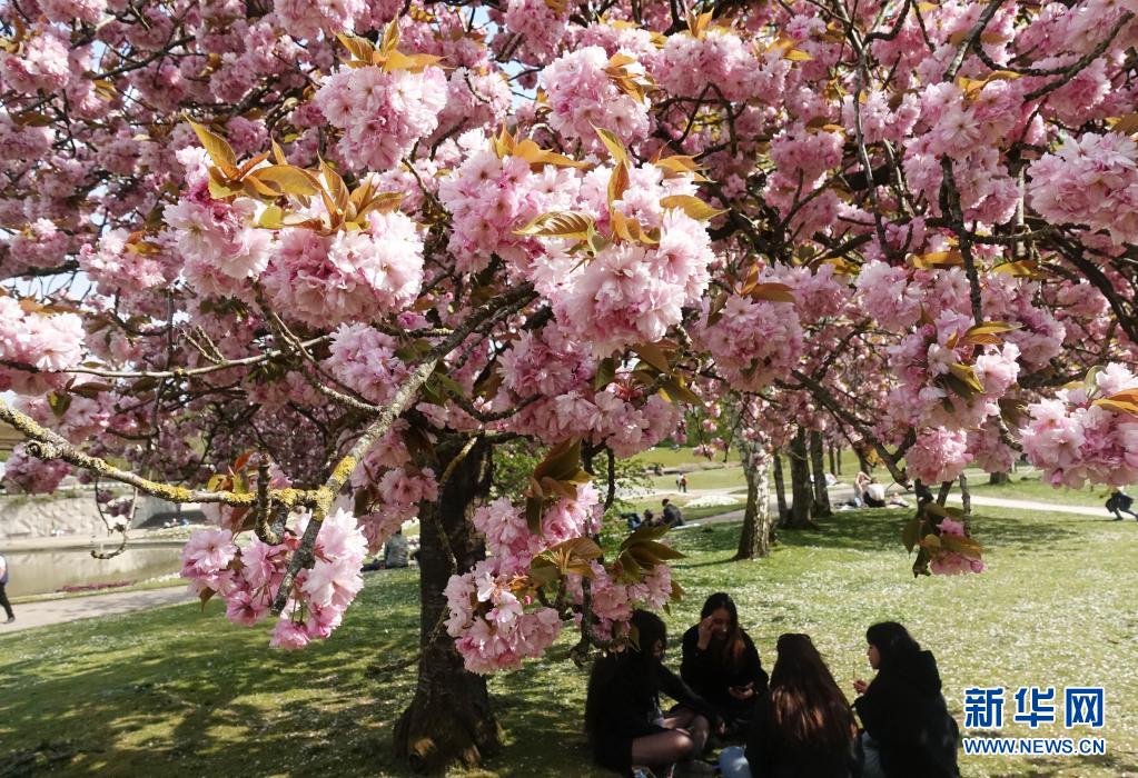 4月21日,人們在法國巴黎一處公園的櫻花樹下休閑。