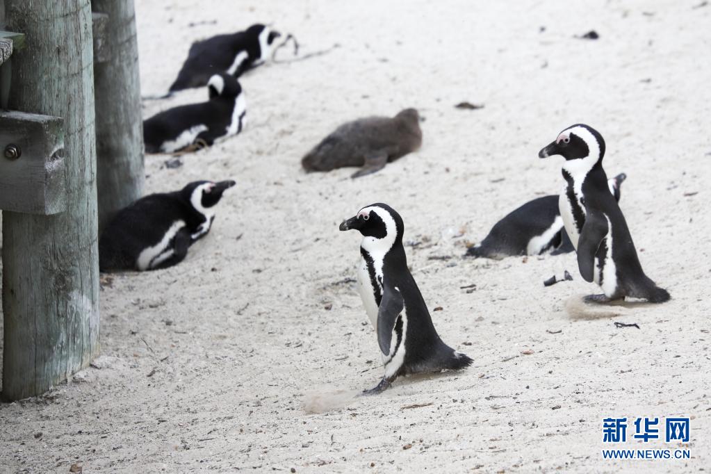 4月25日,一群非洲企鵝在南非西蒙鎮(zhèn)企鵝灘上行走。