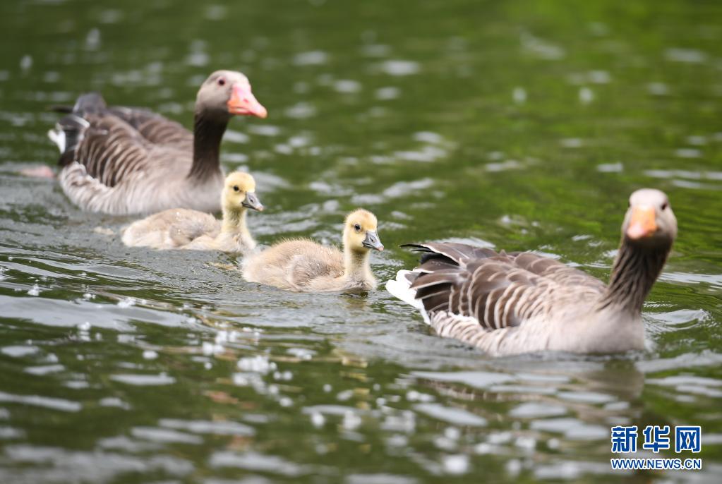這是5月19日在德國(guó)法蘭克福的美茵河拍攝的灰雁。