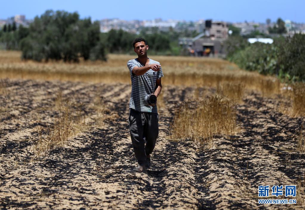 5月22日,在加沙地帶汗尤尼斯,巴勒斯坦農(nóng)民走在被以色列炮擊燒焦的麥田間。新華社發(fā)(亞西爾攝)