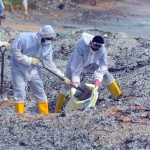 5月27日,安全人員在距離科倫坡30多公里的斯里蘭卡西海岸城市尼甘布清理被海水沖到這里的集裝箱船“X-PRESS PEARL”的碎片。
