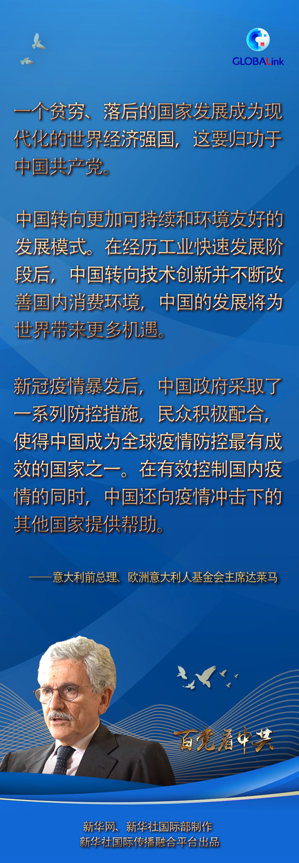 達(dá)萊馬先后擔(dān)任過意大利總理和外長等職,從20世紀(jì)70年代起多次訪問中國,見證了幾十年來中國的發(fā)展。