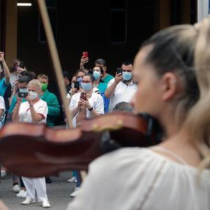 當日,羅馬尼亞首都布加勒斯特一個樂隊在該國一家傳染病醫(yī)院——馬太·巴爾什醫(yī)院演出,向抗擊新冠疫情的醫(yī)務(wù)工作者致謝。