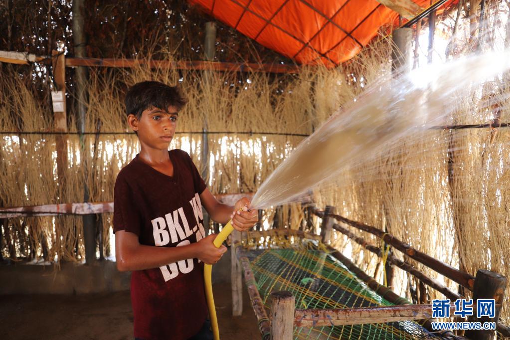 6月17日,一名男孩在也門(mén)北部哈杰省的一座難民營(yíng)內(nèi)給自家的茅草屋澆水降溫。