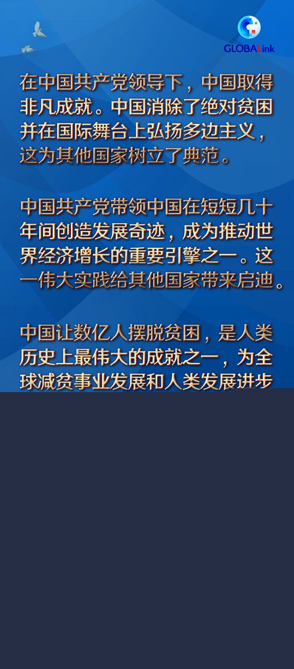 “新中國成立之時(shí),中國還很貧窮。中國共產(chǎn)黨帶領(lǐng)中國在短短幾十年間創(chuàng)造發(fā)展奇跡,成為推動(dòng)世界經(jīng)濟(jì)增長(zhǎng)的重要引擎之一。這一偉大實(shí)踐給其他國家?guī)韱⒌稀!?/p>