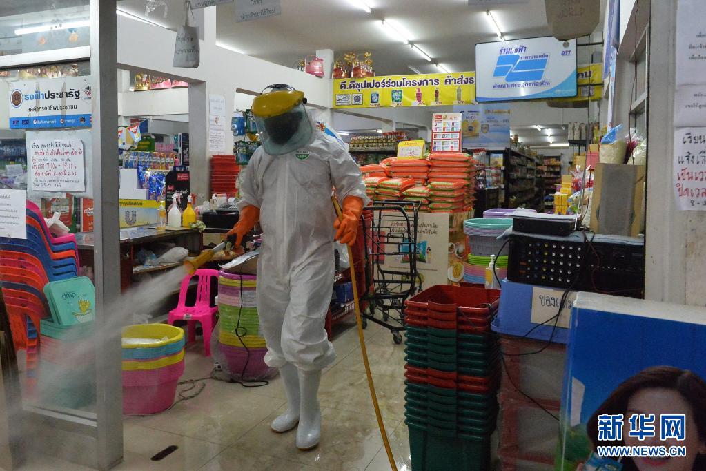 6月21日,工作人員在泰國首都曼谷一處生鮮市場進(jìn)行消毒。